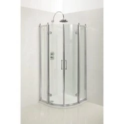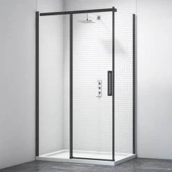 Add a striking feature to an en suite with this Arezzo Frameless Quadrant Shower Enclosure. 900mm wide, it’s designed to fit neatly into a corner of your bathroom with a sweeping curved side to maximise the room’s space. The glass is toughened for safety and accented by striking matt black lines across the surface. You can slide the doors of this Arezzo shower enclosure back and forth smoothly thanks to the chic exposed brass roller. A matching black shower head like the Arezzo Square Thermostatic Shower will further enhance the modern look in your bathroom.